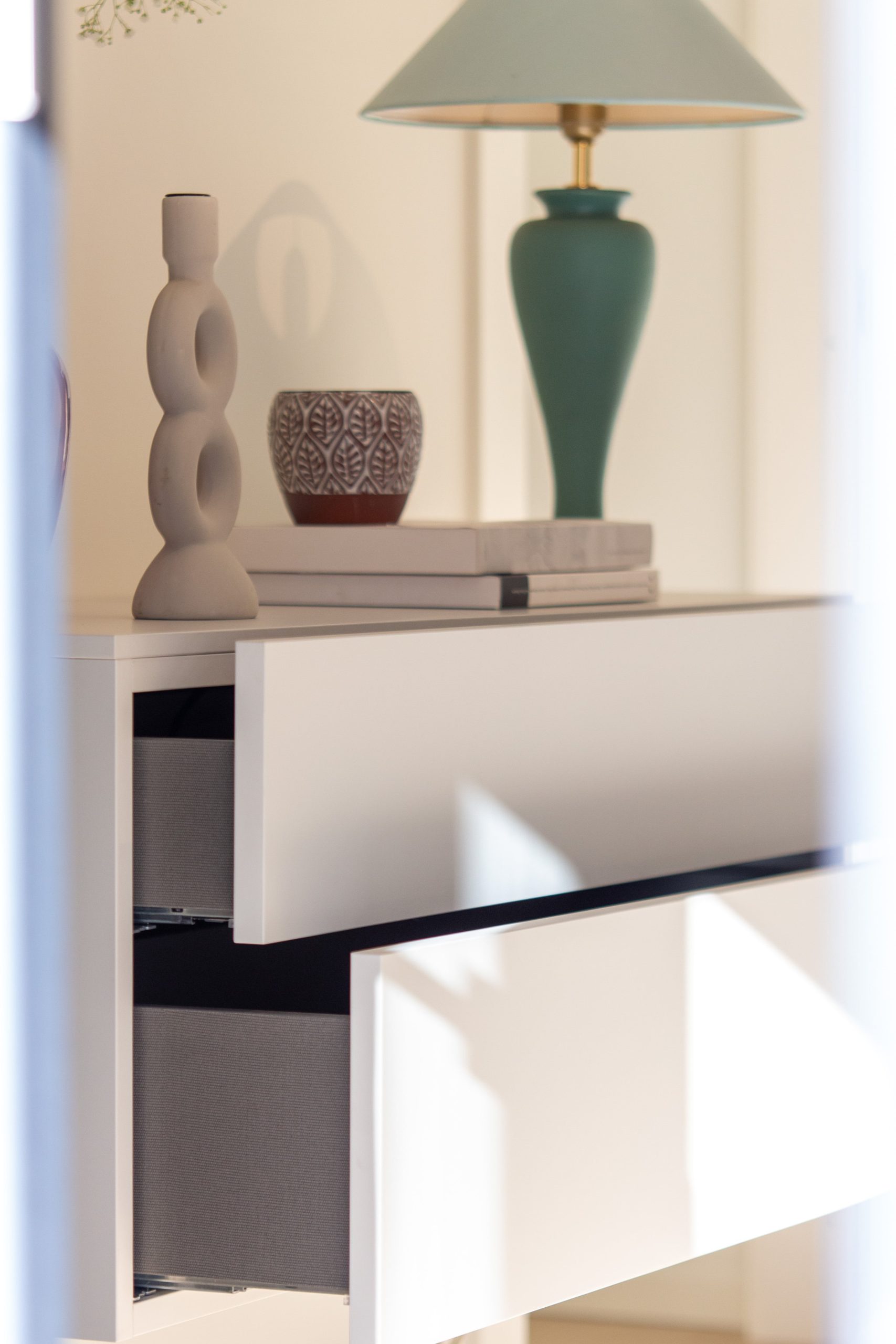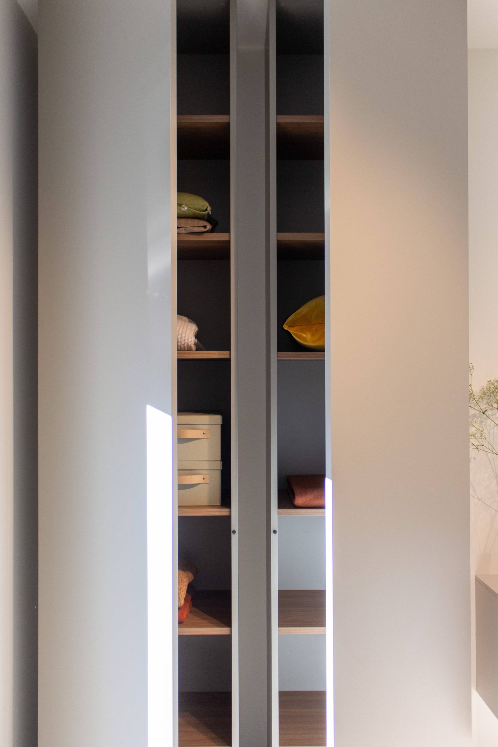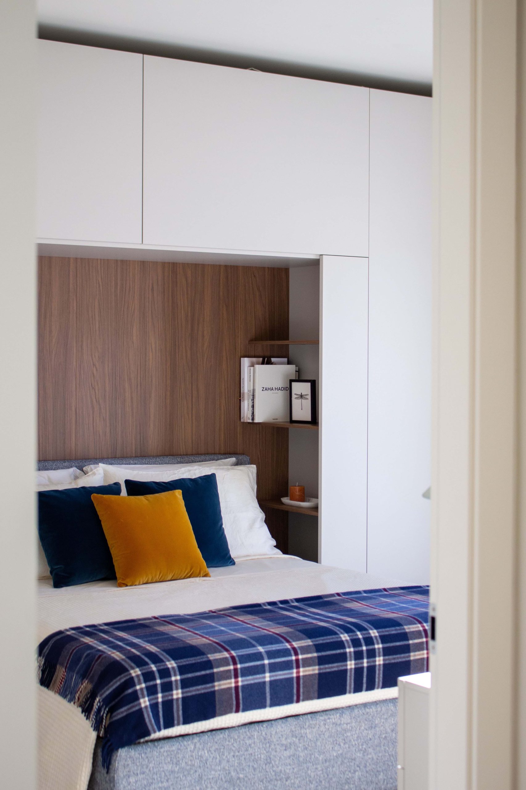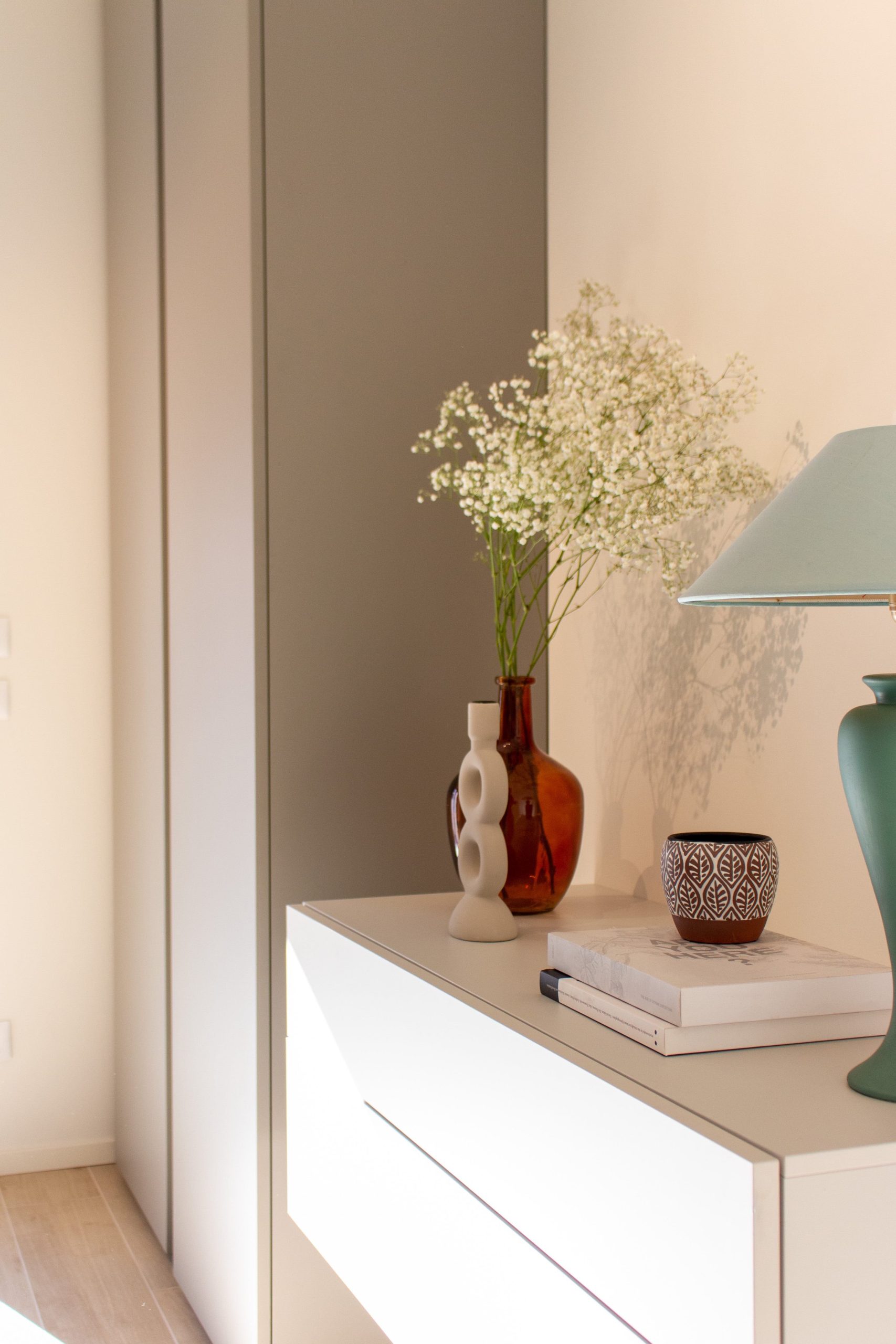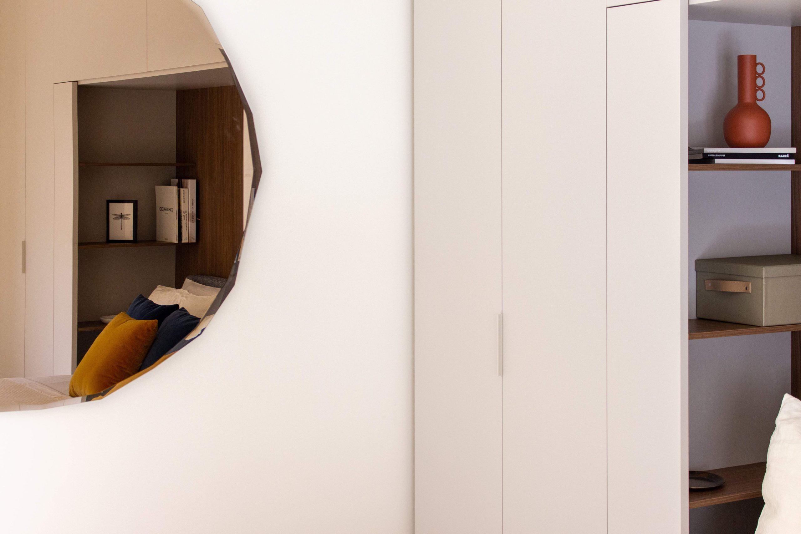 Lo spazio contenuto ha richiesto alcuni accorgimenti: sviluppi verticali, specchi e toni neutri.