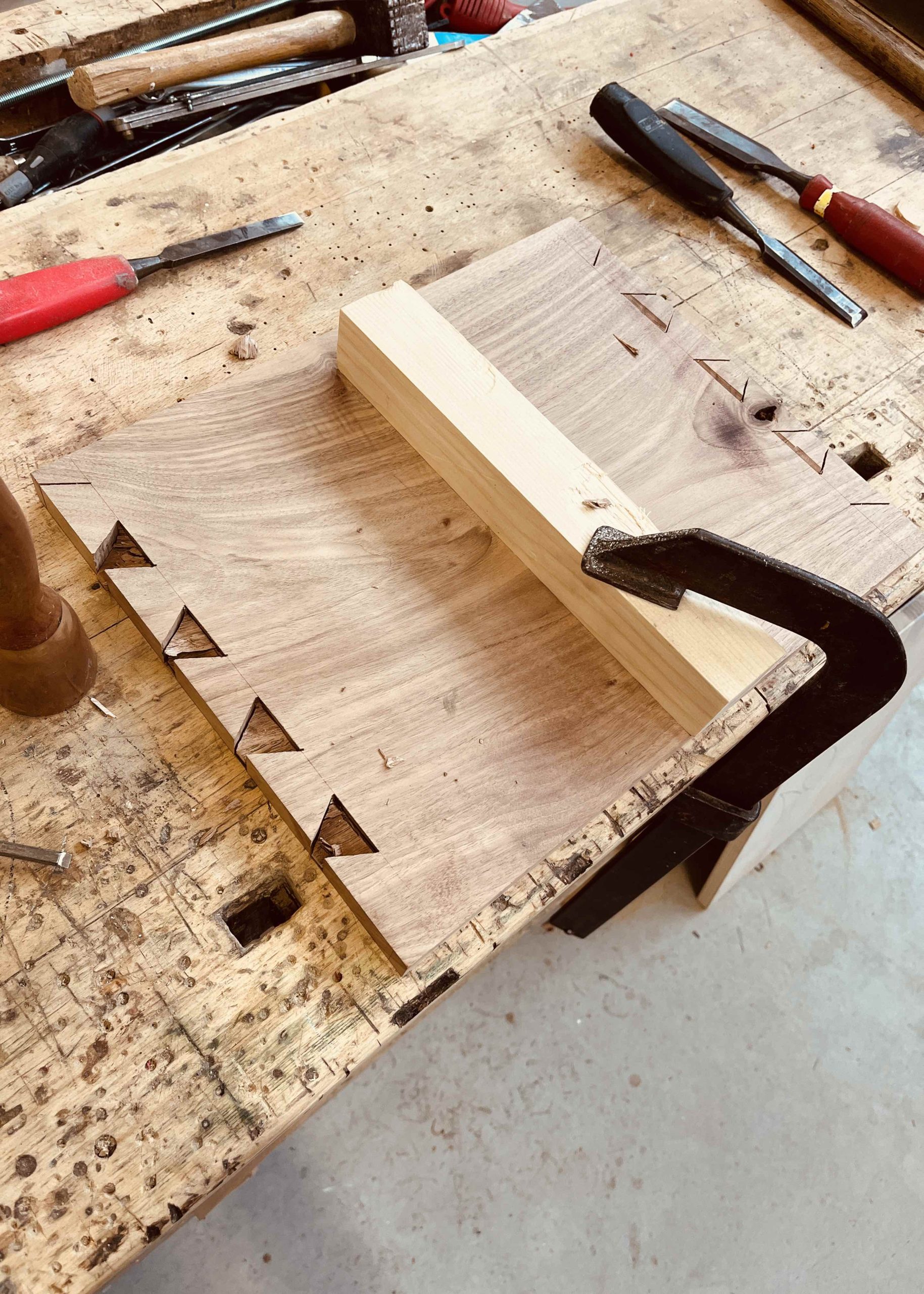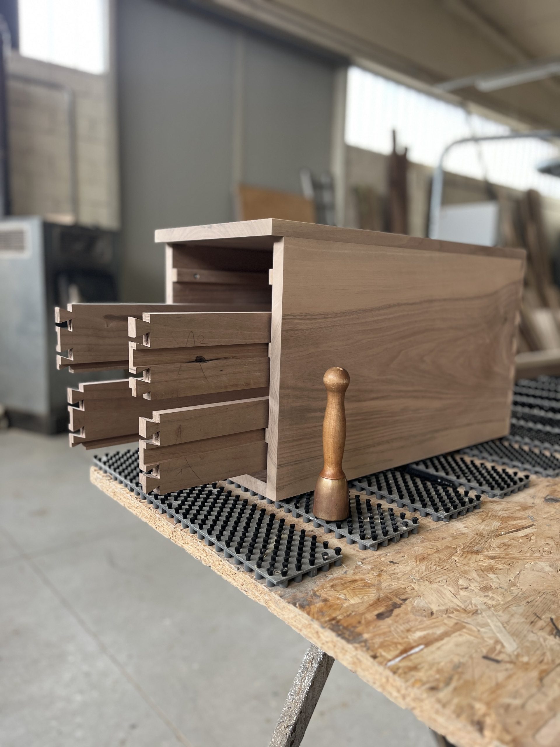 E poi abbiamo l’incastro perfetto tra le parti che sostituisce la ferramenta: la classica coda di rondine, le guide e i giunti in legno.